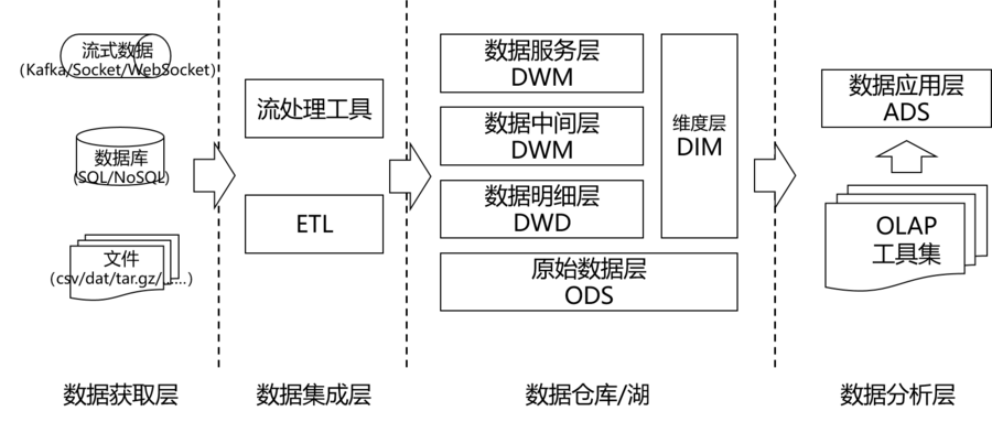 结合各生产应用场景构建流式离线混合架构的实时数据仓库,主要分为以下四层,数据从左到右依次流动,参见图3: