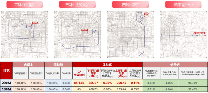 图1 5G实体感知的测试结果 北京联通通过不断推进生产元素数字化赋能,实现了5G SA高品质的业务体验,实现运营管理细化到最小的运营单元,依托强大的IT/CT能力,构建云网一体化融合,推进贯穿端到端的运营流程,总体提升组织运营效率。 五、首发全城大带宽网络,加倍“京”彩 2022年北京联通持续践行5G Capital目标,在打造5G质量领先、技术领先、业务领先、运营领先的基础上进一步升级无处不在的室外千兆5G网络。在5G用户年度4倍增长的背景下,充分发挥200M大带宽和5G设备能力优势,开展规模化200M部署。 从5月份开始通过2个月的快速建设率先实现全球首个全城化200M连续覆盖网络,通过200M大带宽结合上下行载波聚合技术,相比100M带宽实现容量加倍、感知加倍,网络承载能力可同时满足多个大流量应用组合,在网络负荷攀升的同时继续保持感知领先。 发布会期间我们邀请了4家重量级媒体,道路体验北京联通升级后的5G 200M网络,体验起点位于东四北京联通数字化部大楼,共分4条路线覆盖核心城区1-4级道路,线路分别行至二环北部、三环西南部、四环东北部及通州区市政府大楼,整体以主环线及周边毛细道路遍历充分展示5G 200M全面覆盖及贴近寻常百姓生活的感知。 200M测评时我们引入了CA生效比这一新指标,用于体现CA连续性,本次测试平均CA生效比达到了85%。下行平均吞吐率达到885.7Mbps,相比100M网络提升了397Mbps;上行平均吞吐率达到260.4Mbps,相比100M网络提升了87Mbps;同时,信号良好覆盖率保持在99%以上,在超高速业务体验的情况下,手机信号稳定保持在优良水平,通过200M大带宽载波聚合技术实现了感知加倍、体验领先,从日常生活到重要时刻,给人们带来更多惊喜。测试结果详见图2。